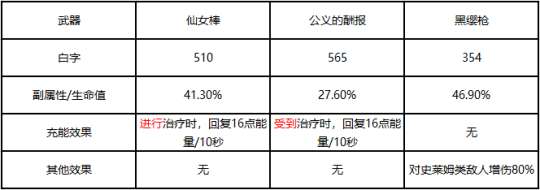 目前生命值加成的辅助长枪有三把,分别是仙女棒、公义的酬报和黑缨枪(史莱姆枪),我们就各项属性进行对比,直观地感受一下三把武器的区别和优势区间。