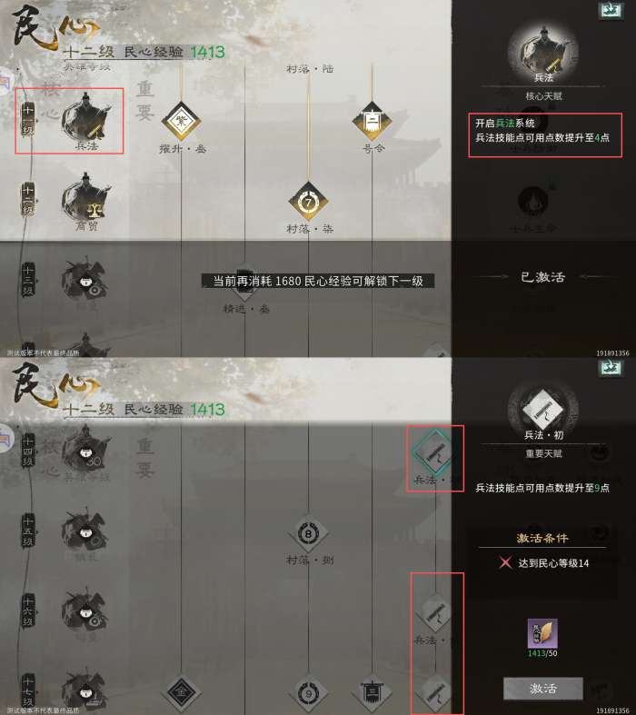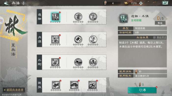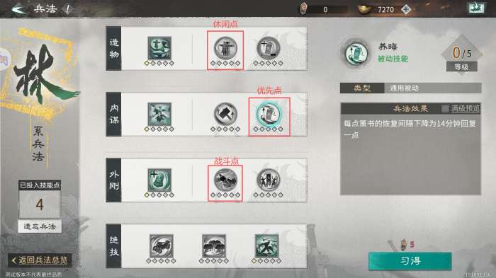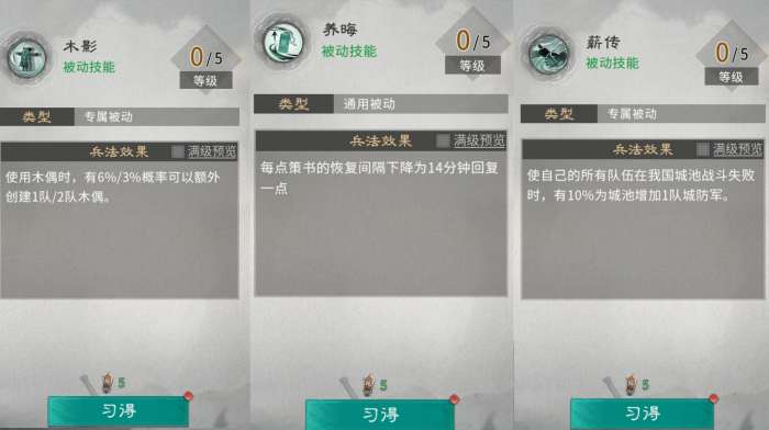 后续兵法技能点优先点出【养晦】,提升获取策书的速度。之后休闲玩家可以点【木影】,提高木偶的获取数量,在有战斗的城池用木偶就行;战斗玩家可以点【薪传】,战斗失败后有概率为城池增加1队城防军。