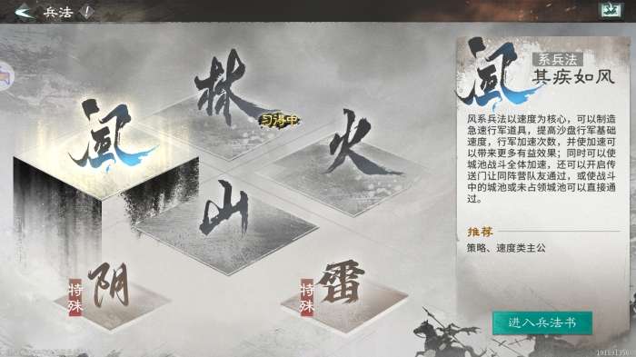 兵法一共分为风、火、山、林、雷、阴6个系,其中雷、阴为特殊兵法,雷系兵法需要担任国家官职后才能使用,阴系兵法需要消耗道具才能使用。剩余的风、火、山、林,四大系,使用兵法技能点加点后即可使用,也是我们这次介绍的重点。