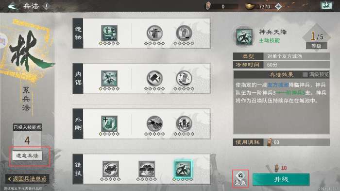 在前期兵法技能点不多的情况下,可以先点出4个主动技能(如下图)。