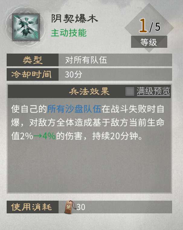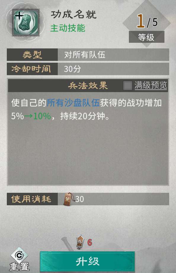 最后一个主动技能【功成名就】可以增加战功,推荐中后期刷战功时使用。在前中期战事激烈的时候,建议还是把策书用在对战斗有帮助的技能上。