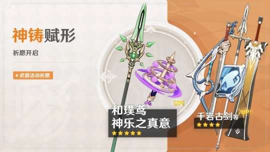 亲爱的旅行者,「神铸赋形」祈愿现已开启:「法器·神乐之真意」「长柄武器·和璞鸢」概率UP!