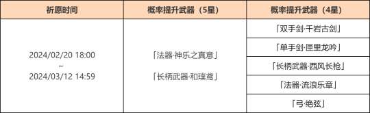 ●活动期间,限定4星武器「双手剑·千岩古剑」,4星武器「单手剑·匣里龙吟」「长柄武器·西风长枪」「法器·流浪乐章」「弓·绝弦」的祈愿获取概率将大幅提升!