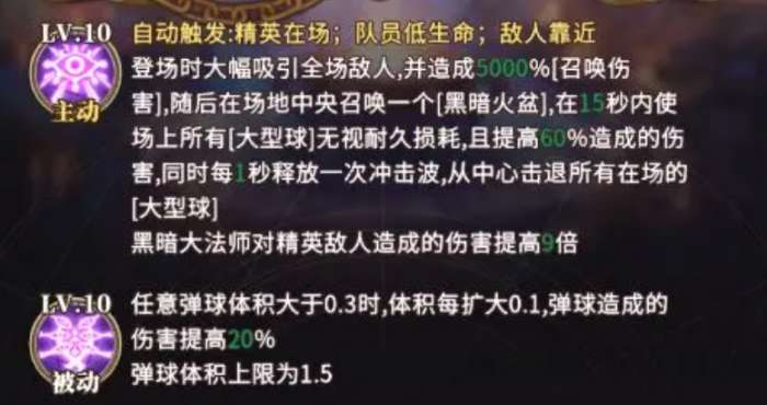 在魔女的类型中,黑暗大法师属于特化类的魔女,黑暗大法师的弹球属于大型球特化类型,它的主动技能可以在有精英敌人在场或者是队员生命值比较低以及由敌人靠近的时候自动触发,当黑暗大法师登场的时候会直接大幅的吸引敌人的仇恨,并且还能够给敌人造成5000%的召唤伤害,随后还会直接召唤出黑暗火盆放置在战场的中间位置,火盆会在15秒的时间内让战场中的所有大型球可以直接无视耐久损耗,且大型球的攻击伤害还会提升60%,每一秒都会释放出一次冲击波,从中心位置将场上所有的大型球,对于精英敌人所造成的伤害能够直接增强9倍。
