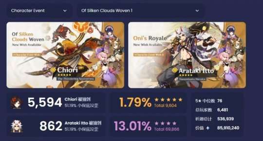 而4.5卡池千织/荒泷一斗,以及专武抽取的详细情况也终于出炉,千织首日一共是出了5594只,荒泷一斗一共是抽取了862只,两个角色抽取的比例在6.48:1左右,一斗基本上就是负责划水了,流水全靠千织,不过千织的流水也非常惨淡,专武抽取的比例差距倒是不大。