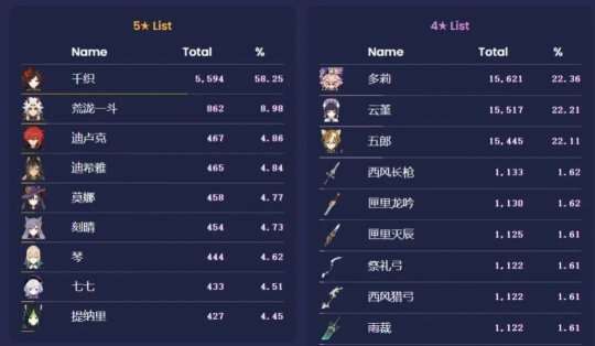 除此之外,就是卡池角色、武器出货的一个详细情况了,具体如上图,本期卡池中歪掉最多的角色是迪卢克、迪希雅、莫娜等角色,四星角色中出货最多的是多莉,其次是云堇和五郎。
