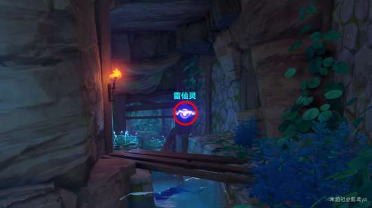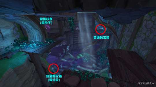 击碎巨石堆后往里走会遇到1个雷仙灵,跟随它归位后可获得1个普通的宝箱。附近的平台处还有1个普通的宝箱和1处雷樱枝条