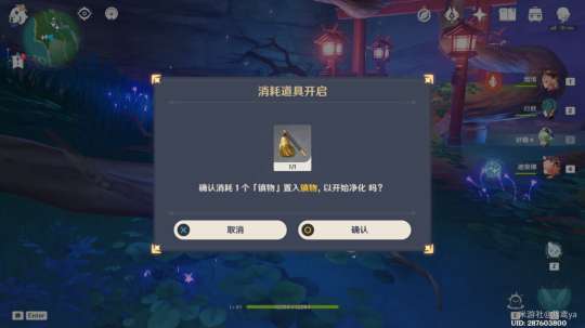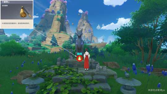 与神秘巫女对话后使用雷元素激活天狐雕像,然后靠近发光点拾取「镇物」触发对话