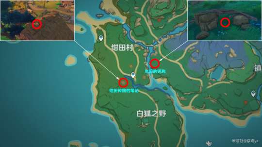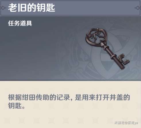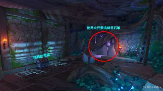 获得老旧的钥匙后返回村长屋子后方的枯井,然后使用老旧的钥匙打开井口的闭锁。下到井底后有1个精致的宝箱,接着使用火元素触发元素反应击碎巨石堆