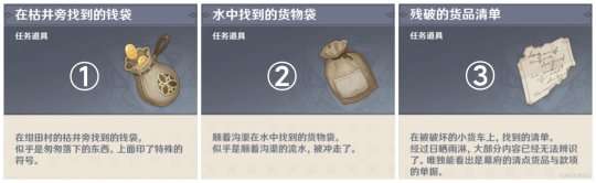 根据三人对话中提供的线索进行寻找会获得三件物品,分别是在枯井旁找到的钱袋、残破的货品清单和水中找到的货物袋