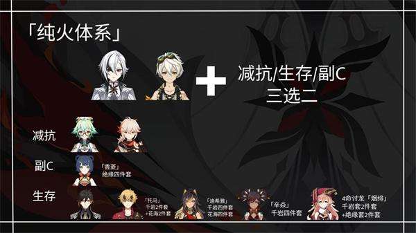该队伍构建原理即围绕火元素直伤为核心,输出手法要求很低,比较简单暴力。