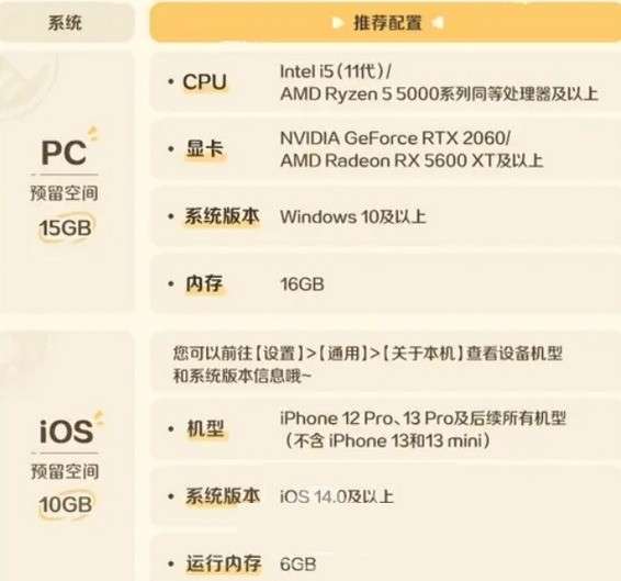 总的来看,崩坏因缘精灵配置要求不算很高,这一测暂时只给出了ios端和pc端的配置需求,移动端的官方配置需求没有给到,这里是对比一下给出了一个大概的推荐配置需求,骁龙8gen1~2,8~12gb运存,10gb存储空间,差不多是这个配置区间,大家如果没有满足这个需求的话,可以考虑升级一下设备,或是用其它平台来体验。