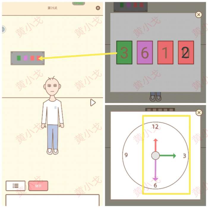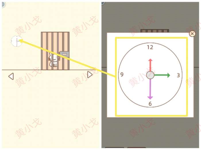 3.(场景1)点击铁板上的密码锁,根据上面的提示(绿紫红红),结合时钟上的线索(红-12、绿-3、紫-6),输入密码:3612