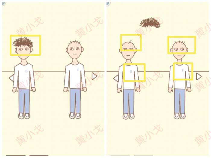 1.(场景3)拿开左侧人的假发,知道他实际的头发就一根(注意他们的头发及他们身上的字母:1-G、4-F)