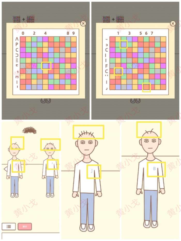 5.(场景2)点击门上的密码锁,根据四个人身上的线索(头发数量及身上的字母:2-B、1-G、4-F、6-J),结合两张表上的线索,调整密码锁:蓝灰蓝橙(在两张表上找到对应的坐标位置,密码是对应的颜色)(顺序是人的顺序,不关头发数量)