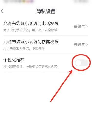 软件提交 专题合集 热门手游布袋鼠小说app怎么关闭广告推送,打开软件我的页面,找到【设置】图标,点击进入,在设置页面找到【隐私设置】选项,点击进入,关闭【个性化推荐】开关按钮,即可关闭个性化推荐功能。