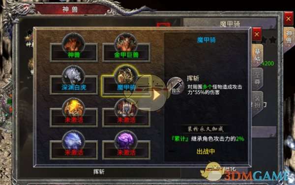 基础神兽开局就送,玩家可以通过首领通缉获得的“神兽精华”来进化神兽,进化后不仅可获得属性提升,还可能激活不同的神兽外观。