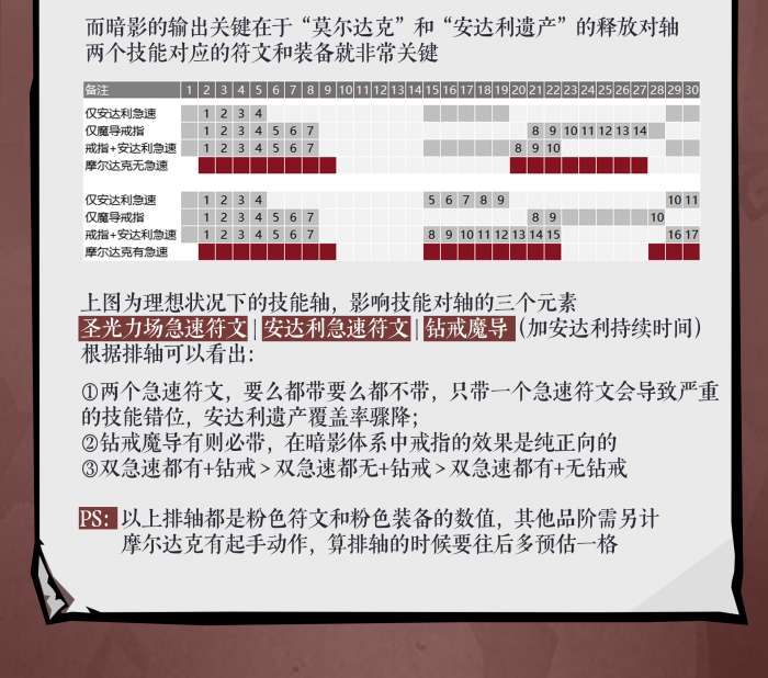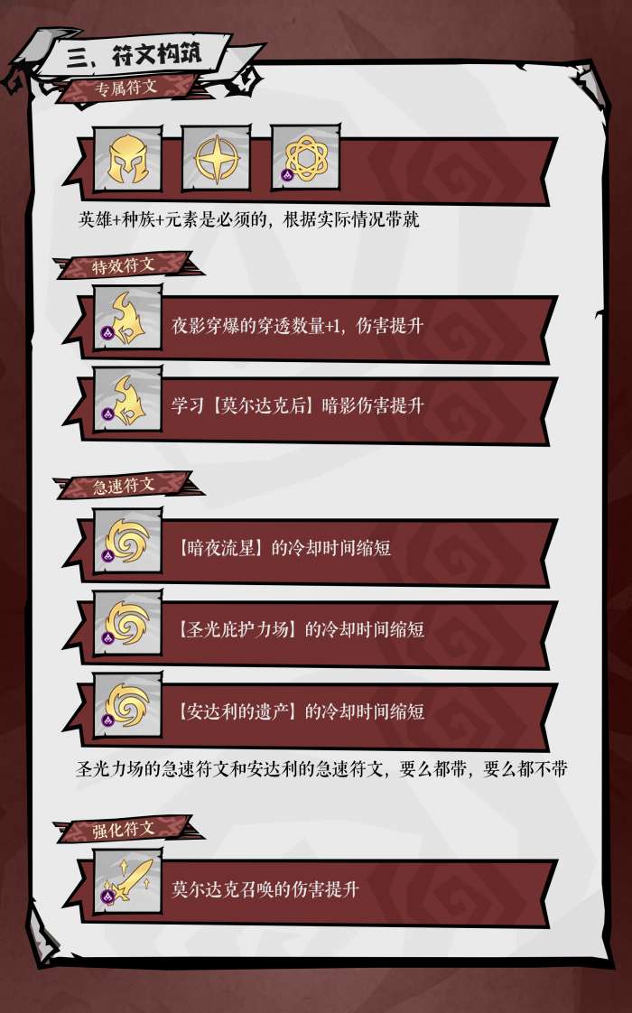 符文搭配应该避免技能错轴的关键。优先选择双急速符文。这里就有一个重要的原则,圣光庇护立场以及安达利遗产的急速符文要同时佩戴,又或者是同时不带。否则就会导致技能在释放时节奏混乱,打破原先流畅的输出循环。如果暂时没有足够的急速符文,也可以选择增伤类的符文过渡,但是要优先保证爆发伤害在线。