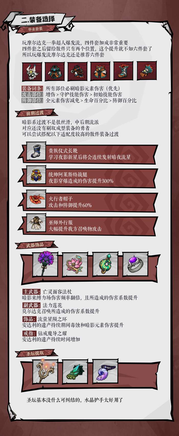 装备搭配方面需要针对性发力,每一件都要为核心体系服务。武器自然就应该选择亡灵面容法杖,可以大幅度的提升法术强度,让暗影伤害更有穿透力。法力莲花是一个专属的增益装备,能强化伤害系数,让召唤物的输出更上一层楼。还有流萤星陨之环以及钻戒魔导之耀。这一些都是很有优势性的,可以让爆发初期变得更出色,输出更加的稳定。词条选择上兼顾输出以及生存,不可以顾此失彼。攻击部位就应该选择暗影元素伤害词条,还可以根据自己的需求去搭配守护技能伤害词条。