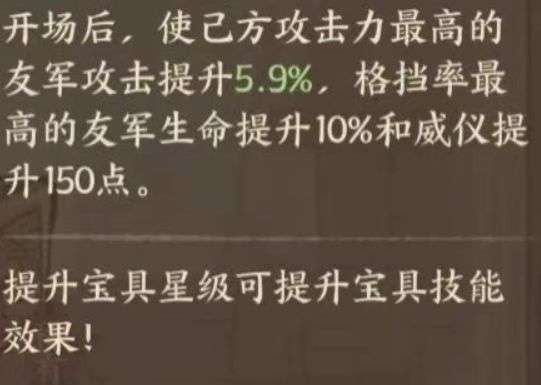 (2)助战技能:开场后,使己方攻击力最高的友军攻击提升5.9%,格挡率最高的友军生命提升10%和威仪提升150点。