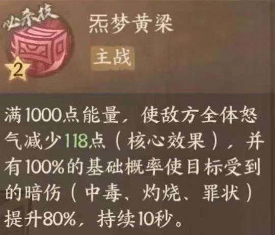 (1)主战技能:1、当能量满1000点时,释放必杀技“炁梦黄粱”,使敌方全体怒气减少118点(核心效果),并有100%基础概率使目标受到的暗伤(中毒、灼烧、罪状)提升80%,持续10秒。