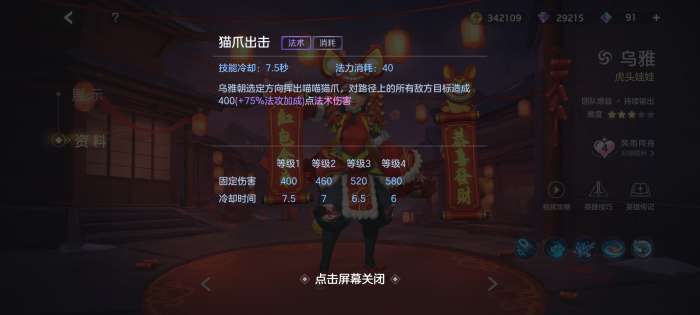 乌雅朝选定方向挥出喵喵猫爪,对路径上的所有敌方目标造成400(+60/lv)(+75%法攻加成)点法术伤害。