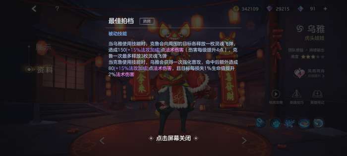 当克鲁使用技能时,乌雅会获得一次强化普攻,命中后额外造成80(+15%法攻加成)点法术伤害,且目标每损失1%生命值提升