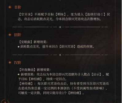 1技能改为获取行动点+1buff,大招除了常规的额外计入启示点,还能赋予目标神经痛debuff,受到即兴咒语攻击后,根据伤害总量额外受到一定比例的本源创伤。