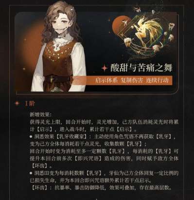 软件提交 专题合集 热门手游重返未来1999游戏里牙仙狂想后转型为增伤辅助,乳牙机制改为己方消耗灵光获取。效果包括提升本队即兴咒语伤害、赋予敌方降低抗暴的坏齿debuff、群体回复生命,并为即兴咒语累积启示点。大招额外附加神经痛debuff,使目标受到即兴咒语攻击后承受额外本源创伤,适配木系及星系启示队。