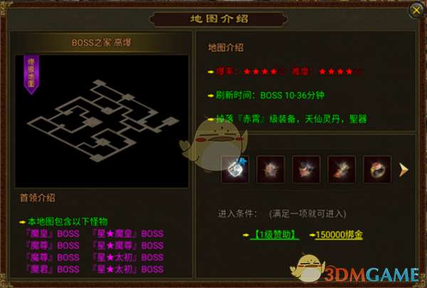 进入该副本需要解锁【1级赞助】,或使用一定的绑金获取进入副本的权限。BOSS之家副本共分为两层,在进入第一层后,可以直接找到第二层的入口。