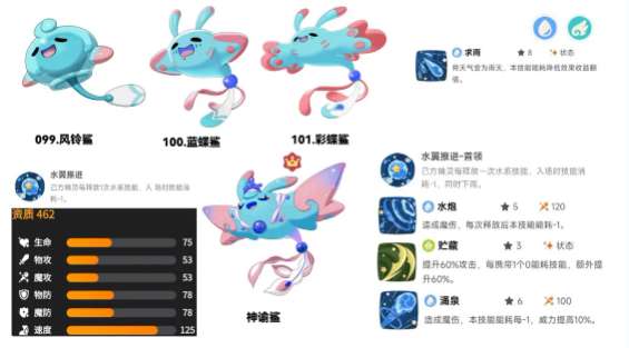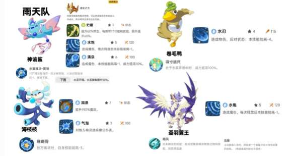 雨天队的配置主要是围绕精灵下雨效果。除了彩蝶鲨,卷毛鸭也成为主要的输出点。水刃在水系的环境中,威力直接翻倍,应对状态时,能耗就可以减4,配合雨天buff就可以直接造成炸裂的伤害。圣羽翼王虽然是异系,但可以学水系技能水泡。主要的特性就是飓风,还是比较适合这一套阵容。其他的精灵在放完相同技能之后,就可以获得迅捷。更换宠物入场时就能释放符合能量要求的技能,收割残血的效率还是比较高的。然后搭配润泽技能,可以提升魔法攻击,整套阵容简单粗暴,靠着高爆发就能打出伤害,不过缺点是容错率相对比较低。