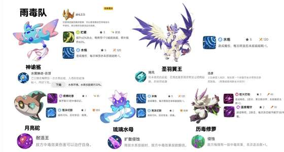 除了雨天泥沼队之外,玩家也可以关注一下雨毒队。在雨天队的基础上,可以增加中毒的机制,拥有比较出色的容错率。核心的思路是首领化之后就会触发下雨的效果,可以先给敌方挂中毒印记,接着琉璃水母就可以有效释放水系技能,让敌人的中毒层数翻倍。接着圣羽翼王靠着迅捷的技能就能有效补充伤害,这一套阵容不仅雨天的水系伤害加成可以提升,还会有持续中毒的伤害。面对肉盾阵容,也可以慢慢去磨,打起来真的还是比较稳的。