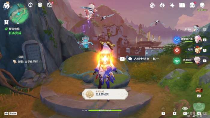 完成对话后,任务结束,获得成就“至上的秘籍”与食谱“古华鱼羊鲜”,任务“秘谷侠隐”结束。