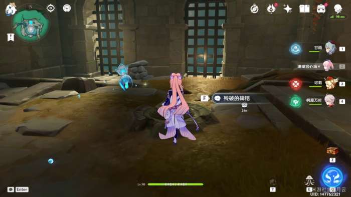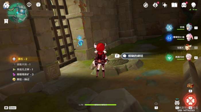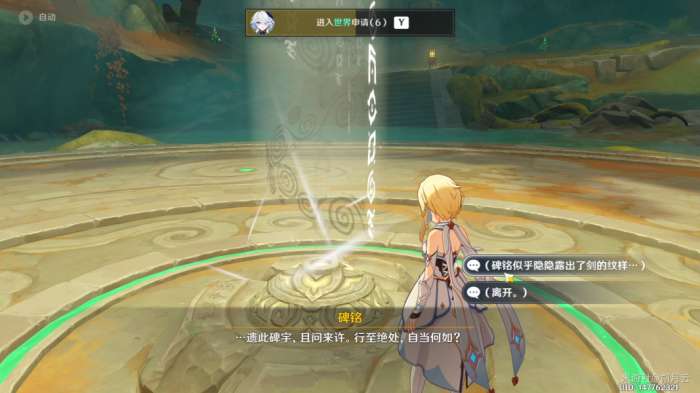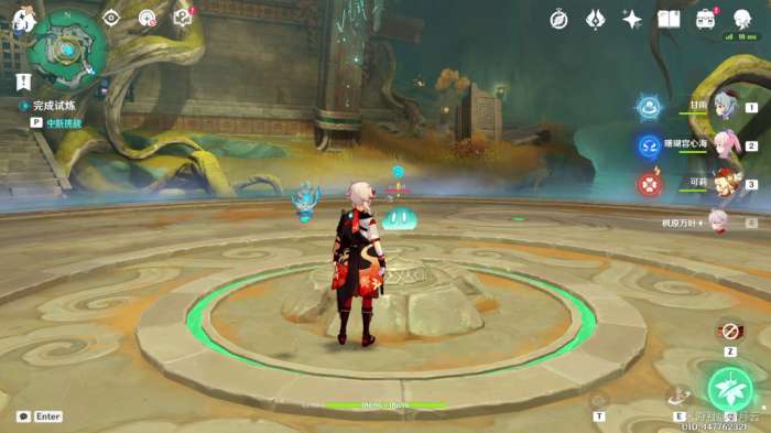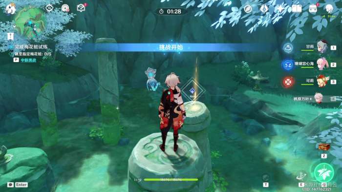 依照任务指示,与平台中央碑铭交互,开启挑战(推荐在开战前更换编队,携带一位回血辅助角色)。