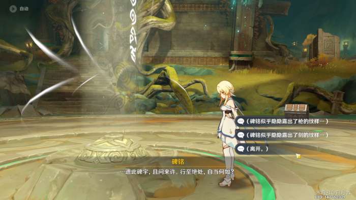 回到中央平台处,选择含“枪的纹样”字样的选项,进行第二重挑战(45秒闪避攻击;推荐携带一位血厚的角色)。