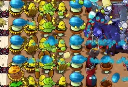 4、然后补充中间的玉米卷香蒲和三行玉米投手,在右侧种植一列冰冻西瓜大喷菇。