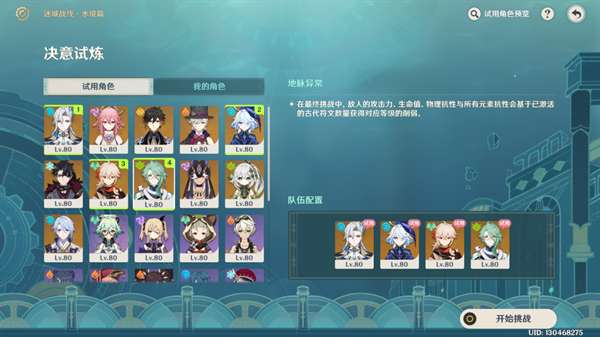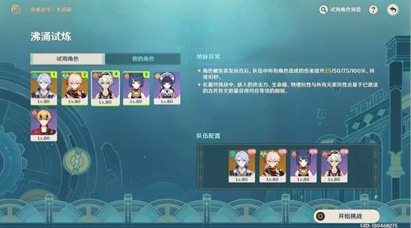 ● 每个试炼中可选择的角色阵容有所不同,只能使用试用角色所展示的角色!使用自己拥有的角色,会继承角色练度。注意:如果没点我的角色上场,那么练度就是试用角色的练度。