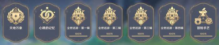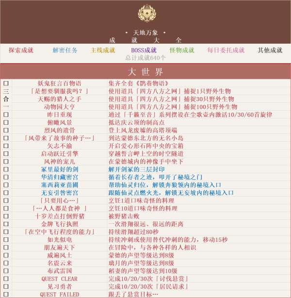 (1)成就共1188个(有2个成就无法获得,神像/露景泉,即最高1186成就),其中天地万象有640个成就