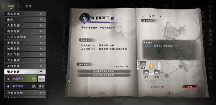 拜师之后,你将获得繁花剑诀,这本剑法的核心技能包括“海棠醉日”和“梨花满枝”。这两招技能不仅具备强大的属性加成,而且在战斗中展现出的招式效果也颇具视觉冲击力。无论是外功还是内功,繁花剑诀的数值都非常优越,适合高阶玩家使用。