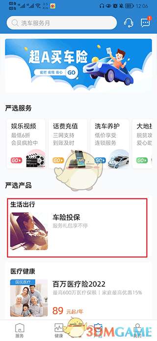 1、打开中国大地超Aapp,在严选界面中点击车险投保