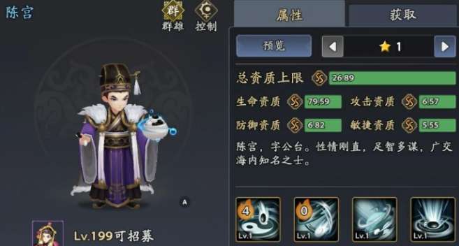 陈宫 + 甄姬 + 张春华 + 廖化 + 貂蝉可以把这一些角色搭配在一起,这一套阵容的控制链相对还是比较稳定的,陈宫并不是一开始就可以招募,而是需要玩家等级提升到199级,然后才可以招募。总资质的上限就是26.89在控制武将中属性还算是很不错的。重点就是技能机制大招就可以针对敌方全体,然后造成48%的攻击力,还会有20%的概率,直接获得三个回合的迟滞,同时还会有20%的命中加成,可以轻松的抵御敌方的闪避,保证控场并不会落空。被动技能更加的厉害。