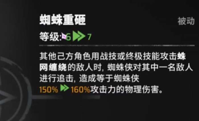 蜘蛛人在漫威秘法狂潮中的核心天赋是“蜘蛛重砸”,该能力可在队友释放战技时触发,将负面效果施加于敌人,并对被蛛网缠绕的目标进行一次追击。这次追击造成高达180%攻击力的物理伤害,同时为蜘蛛人积攒30点终极能量,加快大招释放节奏。这一机制使得蜘蛛人在配合具有频繁战技输出的队友时表现尤为突出,能量获取更加稳定,战斗节奏更流畅。