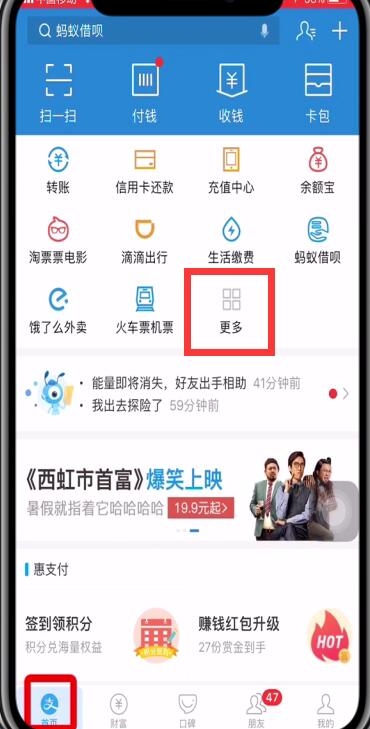 1、打开支付宝,在首页如图所示位置点击【更多】,