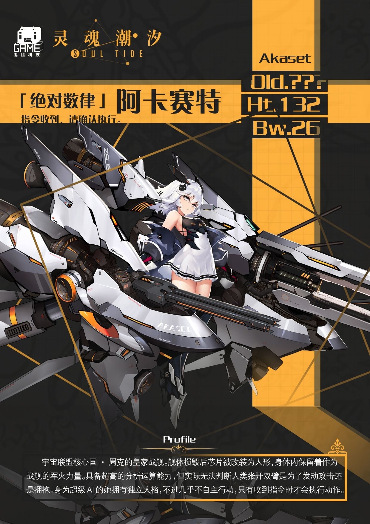 宇宙联盟核心国周克的皇家战舰。舰体损毁后芯片被改装为人形,身体内保留着作为战舰的军火力量。具备超高的分析运算能力,但实际无法判断人类张开双臂是为了发动攻击还是拥抱。身为超级AI的她拥有独立人格,不过几乎不自主行动,只有收到指令时才会执行动作。
