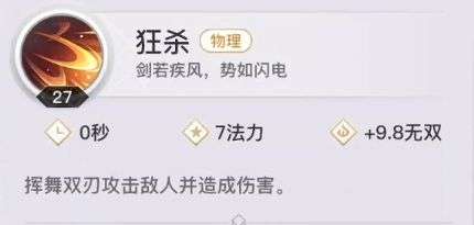 【狂杀】每第三次普攻会触发三连击,造成额外伤害(约一段普攻的1.4倍),是打本攒无双的最快手段。