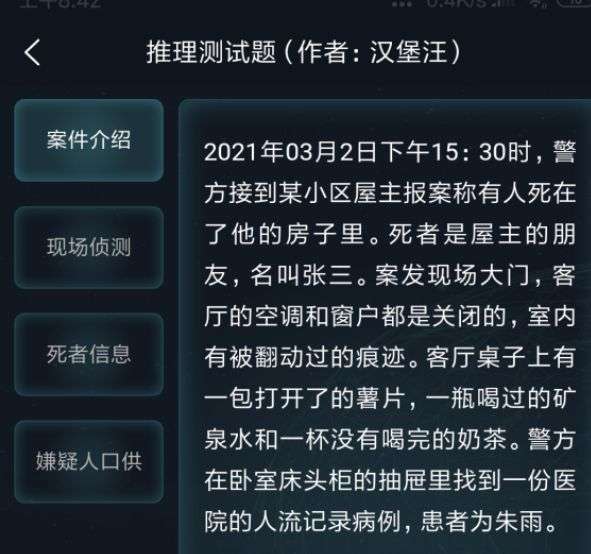 2021年03月2日下午15:30时,警方接到某小区屋主报案称有人死在了他的房子里。死者是屋主的朋友,名叫张三。案发现场大门,客厅的空调和窗户都是关闭的,室内有被翻动过的痕迹。客厅桌子上有一包打开了的薯片,一瓶喝过的矿泉水和一杯没有喝完的奶茶。警方在卧室床头柜的抽屉里找到一份医院的人流记录病例,患者为朱雨。