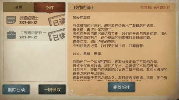 落幕时,玩家会在不幸的“喜剧”和“幸福”的悲剧中做出选择,而可以得到两种不同的回信,分别是最后的骑士与歧路的骑士。