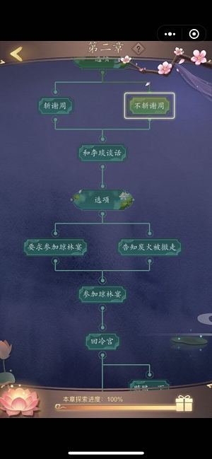 李琰倒下后,选择向右,遇见端妃后选择沉默,如果在前一章与太监抢过暖炉的话,选择有点过意不去就会解锁剧情贰,最后回到自己的冷宫,与采薇秉烛夜谈,询问更多关于王爷的事情会提升好感;