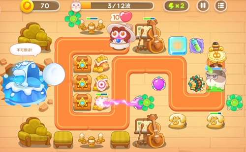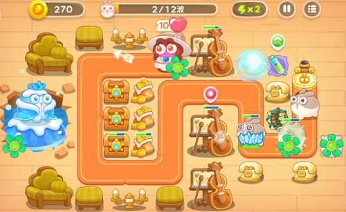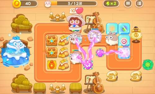在出口放个2级风扇和多重箭,打兔子的同时能清理右上方的建筑。多重箭开始可以先打大提琴,因为刚开始出的普通兔子,风扇能应付。