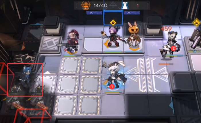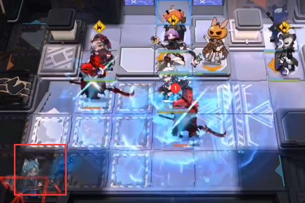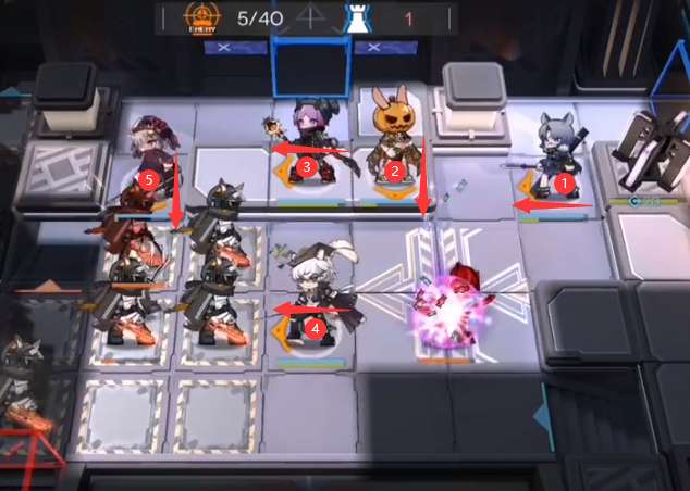 银灰再部署CD完后,如图所示部署(向下),然后部署重装(向上),先锋可以放在奶盾背后增加一下阻挡数。